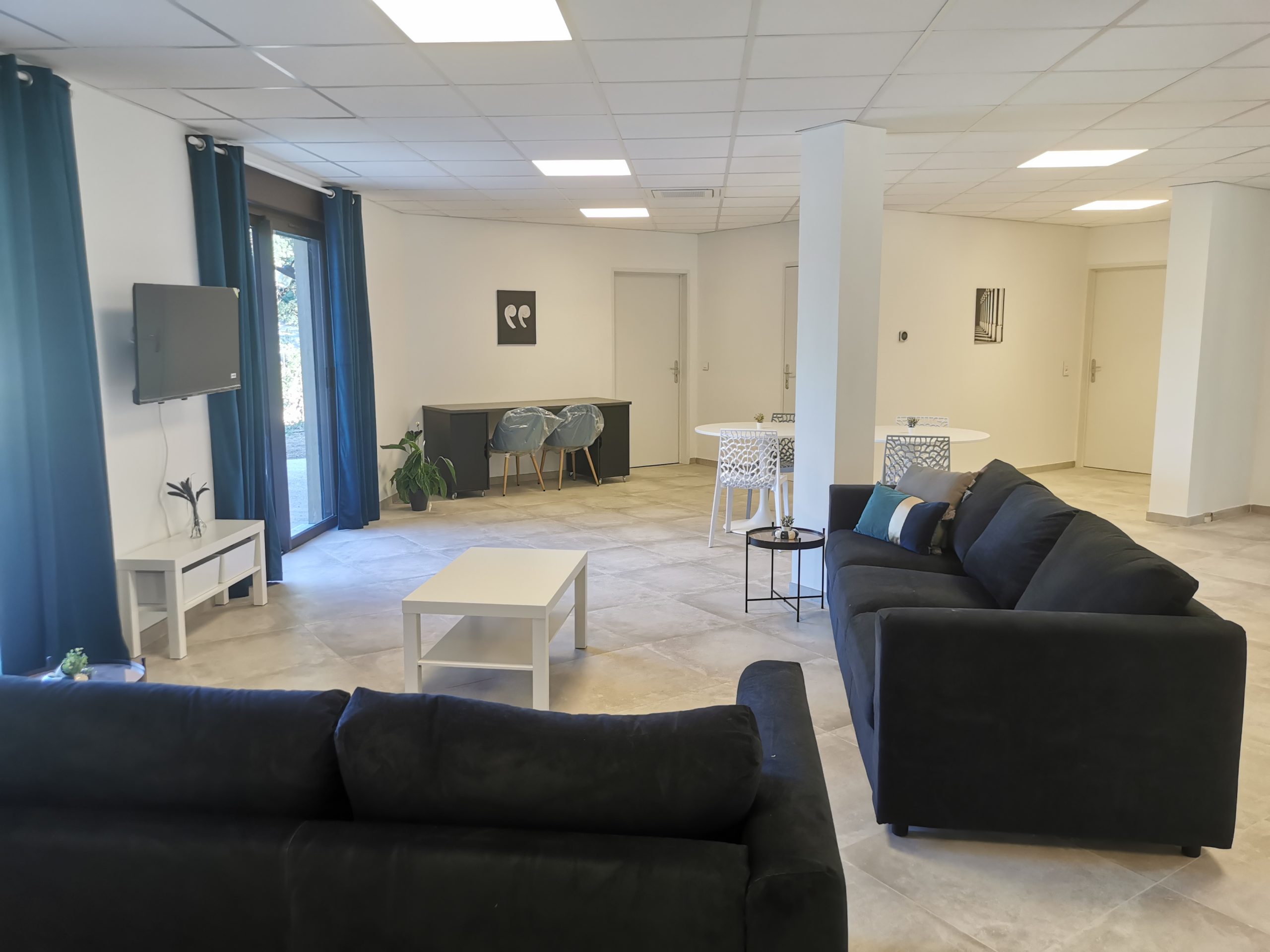 - Un grand espace ouvert composé d’un séjour, cuisine ouverte, salon & coin multimédia communs, un WC indépendant ainsi qu’une buanderie commune.